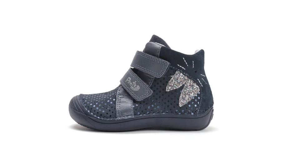 Aceste pantofi supinație Ponte20 albastru închis pentru fete vor cuceri inimile copiilor cu strălucirea lor solidă și motivul jucăuș cu sclipici. Micile perforații din partea superioară le fac bine ventilate, ceea ce le face o alegere excelentă pentru primăvară și toamnă. Designul din piele naturală oferă o purtare confortabilă pe tot parcursul zilei, rămânând în același timp durabil și ușor de curățat. Reglarea încorporată a supinației ajută la corectarea înclinării spre interior a gleznelor, promovând o postură corectă a piciorului și dezvoltarea mișcării. Cele două curele Velcro facilitează încălțarea și asigură un suport adecvat, ceea ce le face o alegere ideală pentru creșă sau grădiniță. După selectarea mărimii, puteți vedea lungimea tălpii interioare a pantofului!