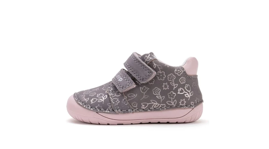 Acești frumoși pantofi desculți D.D. Step, de culoare gri-roz, din piele, sunt alegerea perfectă pentru fetița ta. Întreaga suprafață a pantofului este acoperită cu un mic imprimeu floral, care este făcut și mai fermecător de detaliile roz. Designul desculț asigură libertate naturală de mișcare și o senzație de mers desculț, susținând în același timp dezvoltarea naturală a piciorului. Partea superioară din piele naturală este durabilă și bine ventilată, iar talpa moale și flexibilă asigură confort maxim. Cele două curele Velcro permit încălțarea și descălțarea ușoară, precum și o potrivire precisă. O alegere perfectă pentru grădiniță, creșă sau chiar pentru purtarea de zi cu zi. După selectarea mărimii, poți vedea lungimea tălpii interioare a pantofului!